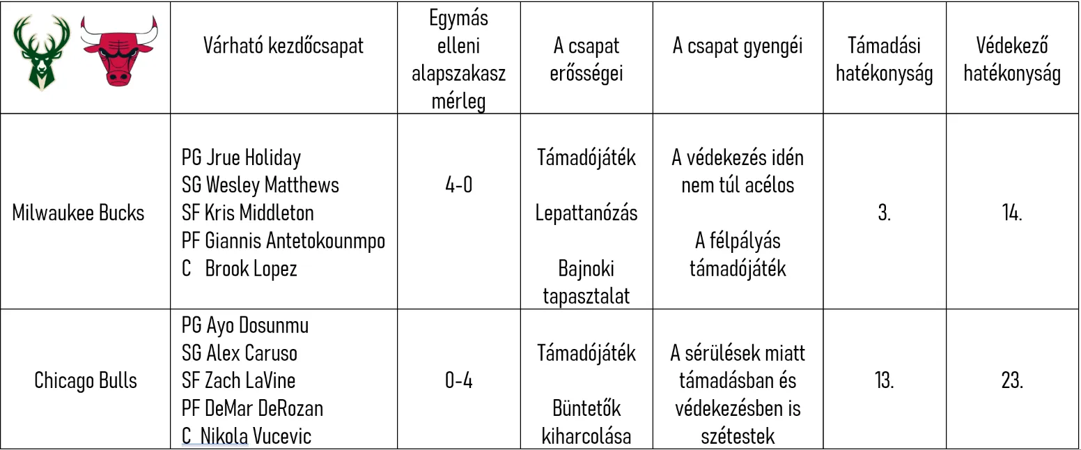 Sajnos a Chicago-szurkolók joggal lehetnek pesszimisták, a Bucks alapból nehéz ellenfél számukra, és ez még akkor is igaz lenne, ha a szezon elején látott, egészséges, védekezésben és támadásban is top 10-es bikák futnának ki a parkettre. Így, hogy Lonzo Ball egyáltalán nem játszhat, Alex Caruso és Patrick Williams pedig csak nemrég tért vissza sérüléséből, nem is tudom, minek kellene történnie ahhoz, hogy a Bulls reális esélyekkel várhassa ezt a párharcot (valószínűleg egy Giannis-sérülésnek). A bikák védekezése a liga egyik legrosszabbja az elmúlt hónapokban, ez pedig gyakorlatilag leküzdhetetlen akadályt állít eléjük, a Bucksnak viszont tökéletes első körös ellenfél lehetnek az üzemi hőfok eléréséhez.