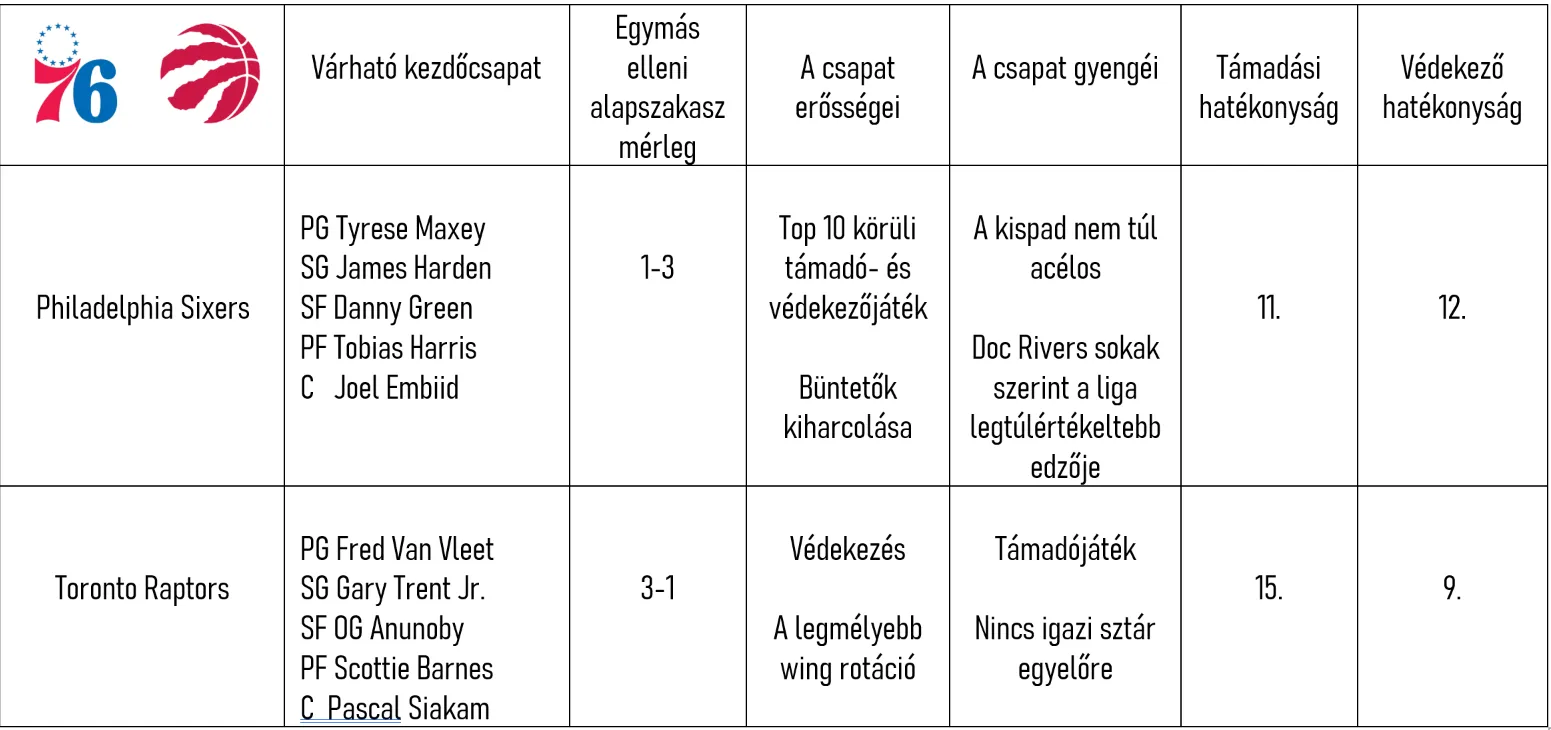 A Raptors kifejezetten szörnyű párosítás a Sixers és főleg Embiid számára, aki eddigi pályafutása 17 Raptors elleni meccsén 21 pontot átlagol, és mindössze 42 százalékja van a mezőnyből. Ennél szinte garantáltan jobb lesz most, de a Raptors csapatvédekezése meg fogja izzasztani őt. A nagy kérdés Harden teljesítménye, és valószínűleg ez fogja eldönteni a párharcot is. Ha az első négy Sixers-mezben lejátszott meccsén látott játékost látjuk most viszont, a Sixers nyerni fog, de ha folytatja a sorozatos betliket, egyszerűen nem látom magam előtt, hogyan mehet tovább a Philly.