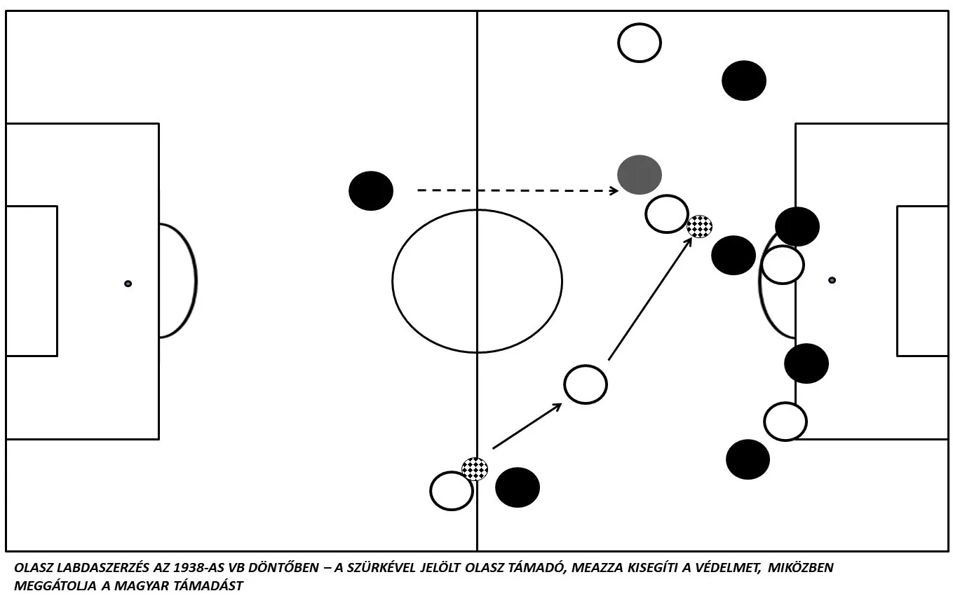 Mint az alábbi ábrán látható, a magyarokkal ellentétben az ellenfél támadói kisegítették gondban lévő védőtársaikat. Ez az olasz együttes minden játékosára jellemző áldozatvállalás és előrelátó gondolkodás teremtett különbséget a magyar és a talján együttes között a döntőben.