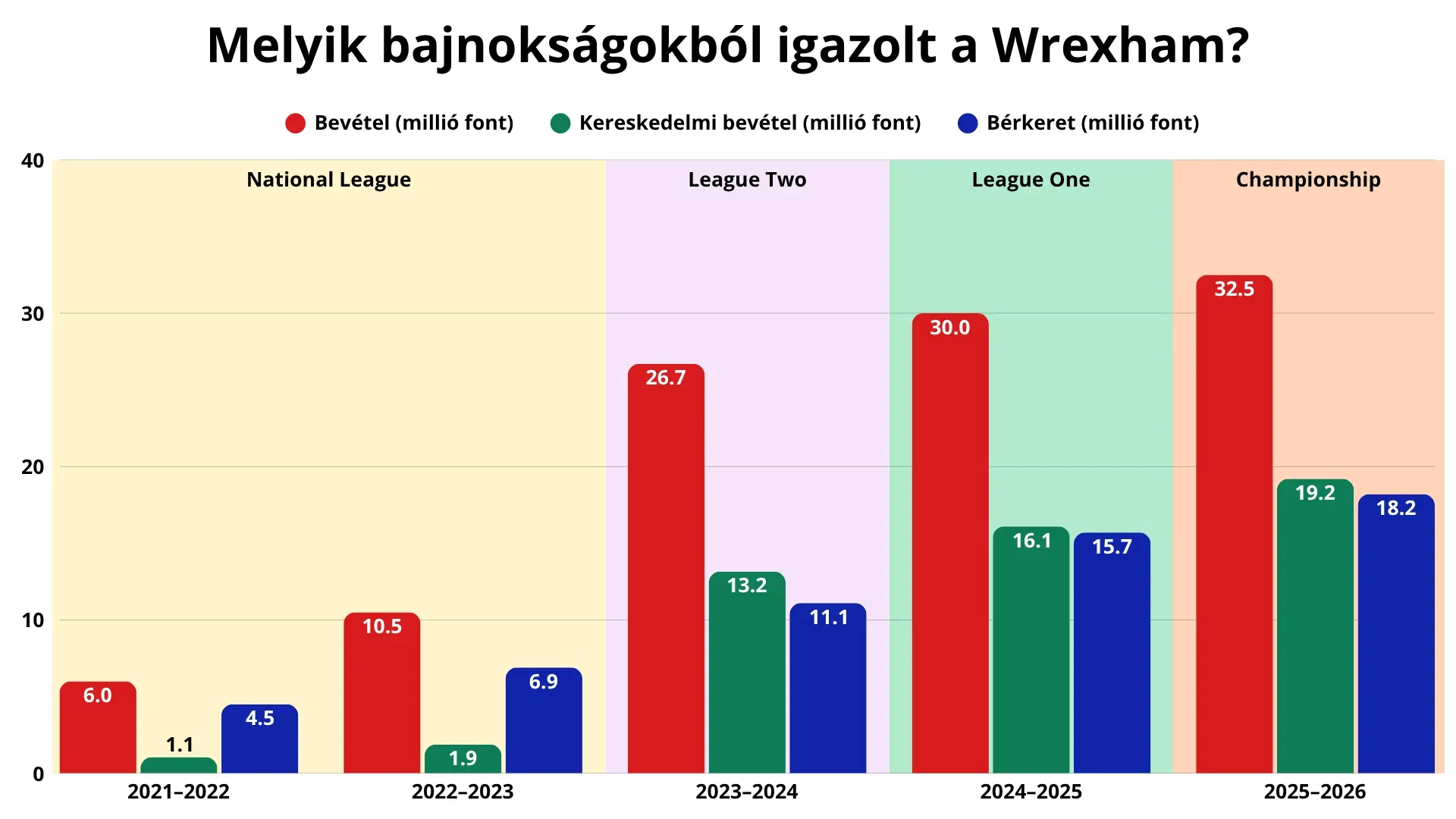Ez a stratégia azonban nem önmagában létezik, hanem egy végig következetesen felépített gazdasági háttérre épül. A tulajdonosváltást követően a klub bevételei néhány év alatt többszörösükre nőttek, amiben kulcsszerepet játszottak az olyan globális partnerek, mint a TikTok, a United Airlines, a HP, valamint a Welcome to Wrexham által generált nemzetközi figyelem. A kereskedelmi bevételek aránya extrém módon megugrott, és a klub gyakorlatilag egy médiatermékké vált, amelynek futballcsapata egyszerre sport- és tartalomgyártó egység.