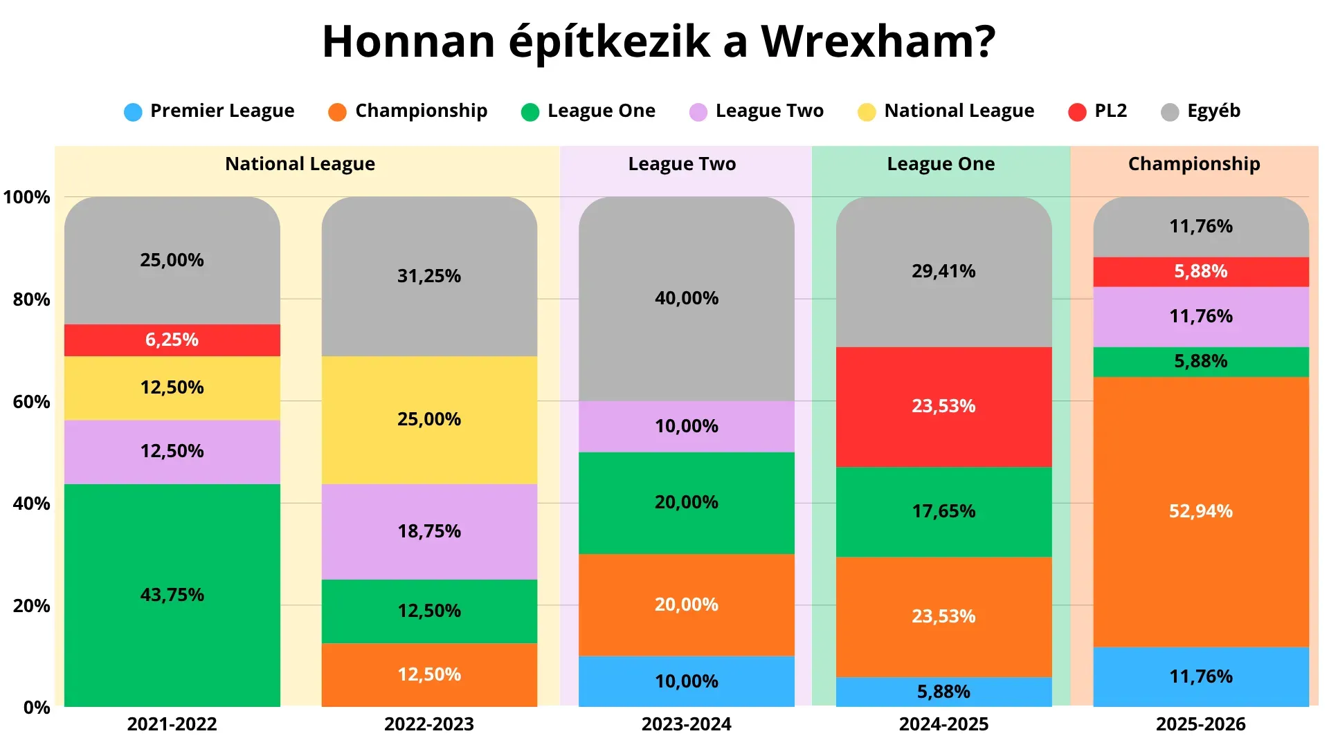 A hipotetikus PL-szereplés megértéséhez először azt kell tisztázni, hogy a walesi együttes eddigi felemelkedése mögött nem egy klasszikus, alulról építkező modell állt. Ryan Reynolds és Rob McElhenney befektetése az első pillanattól kezdődően hatalmas ambíciókkal volt ellátva, és hiába indult a történetük az angol futballpiramis ötödik ligájából, hiszen korábban minden egyes szinten egy magasabb osztály logikáját húzta le saját magához.