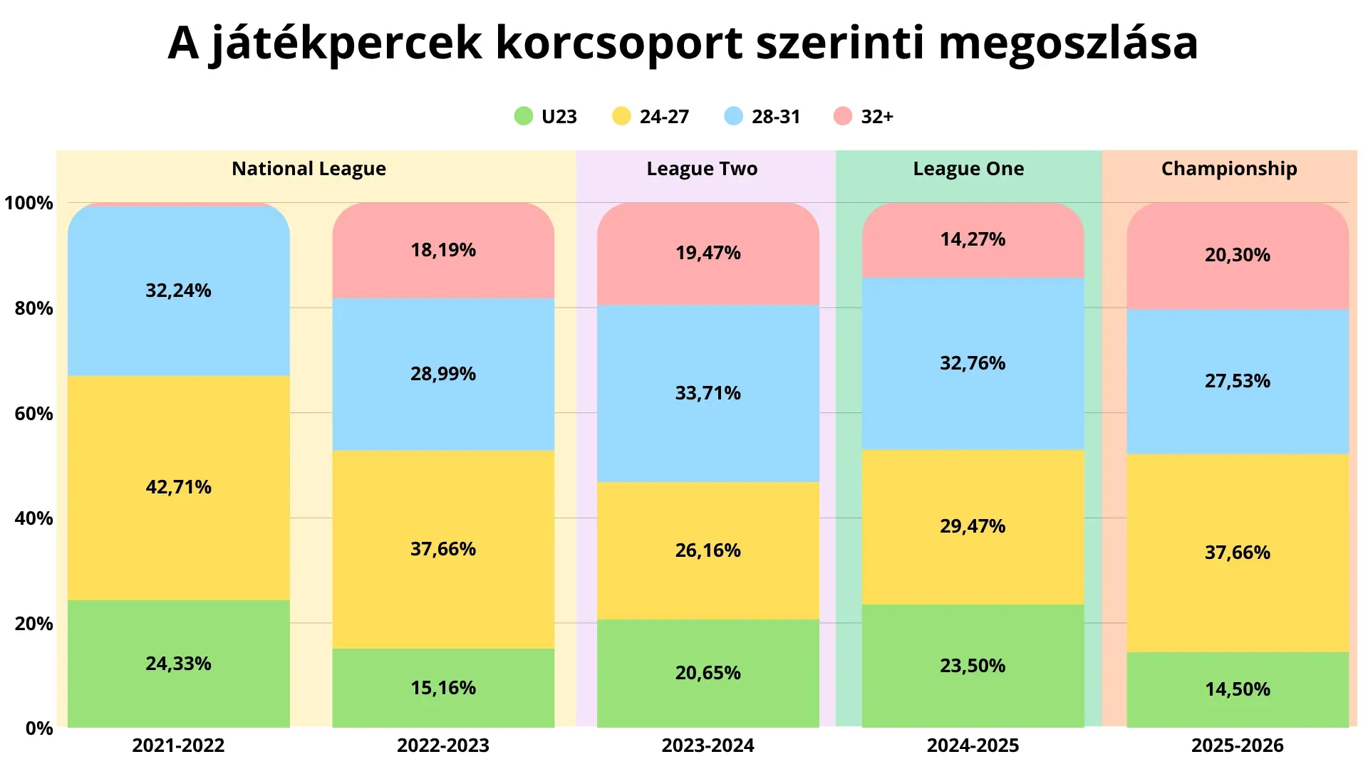 A keret összetétele pontosan lekövette ezt a logikát. A játékpercek eloszlása azt mutatja, hogy a Wrexham minden szintlépésnél tudatosan a rutinhoz nyúlt vissza. Amikor a 2021–2022-es idényben nem jött össze a feljutás, a következő szezonra megnőtt a 28 év felettiek, különösen a 32+ korosztály szerepe. A negyed- és a harmadosztályban egy már meglévő, League One-szintű keretbe integráltak fiatalokat, ami ideiglenesen kiegyensúlyozta a szerkezetet. A Championship szintjén azonban ismét visszaszorult az U23-asok szerepe, és a klub újra a tapasztalt játékosok felé tolódott.