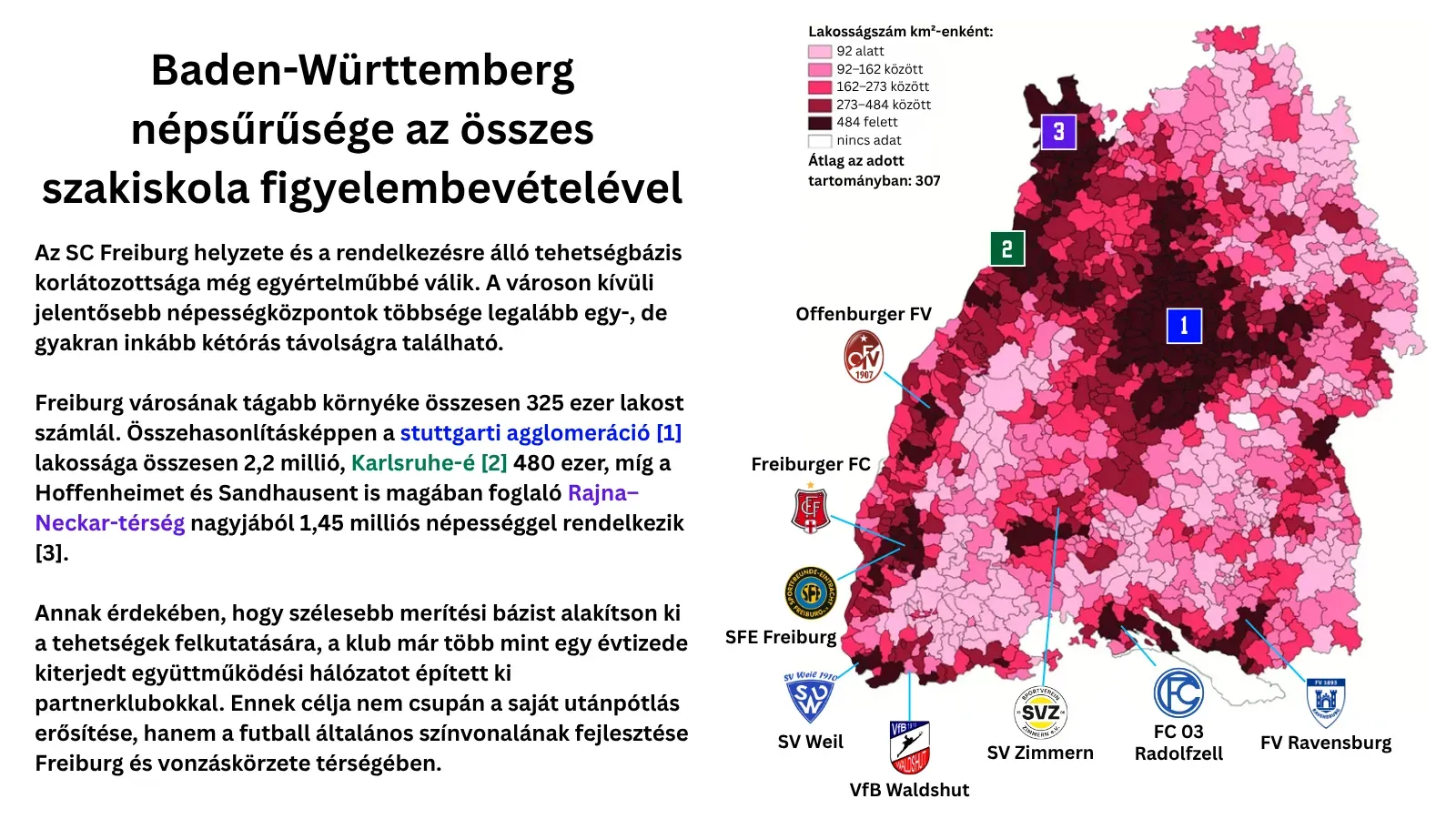 Ebben a klub földrajzi helyzete kulcsszerepet játszott. Freiburg im Breisgau Németország egyik legdélebbi nagyvárosa, amelynek közvetlen vonzáskörzetében a jelentősebb települések már jellemzően Svájchoz vagy Franciaországhoz tartoznak. A hazai piacon így egy alacsony népességű régióra támaszkodik a klub, korlátozott gazdasági háttérrel és kevés szponzorációs lehetőséggel. Ez a kombináció egyértelmű versenyhátrányt jelentett, amelyet a hagyományos eszközökkel, az átigazolási piacon vagy a bérversenyben nem lehetett ledolgozni.