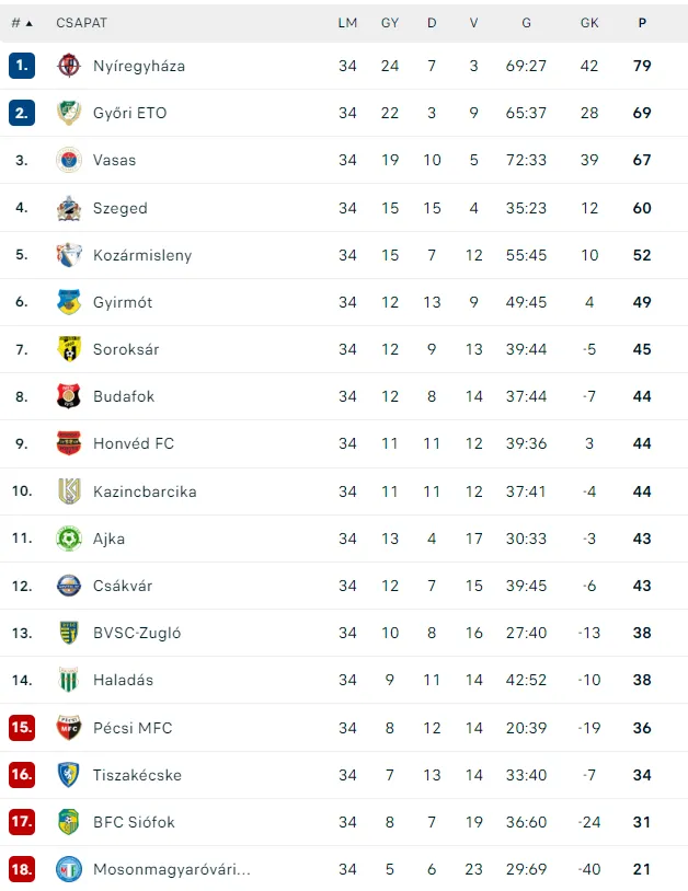 A Merkantil Bank Liga végeredménye (Forrás: eredmények.com)