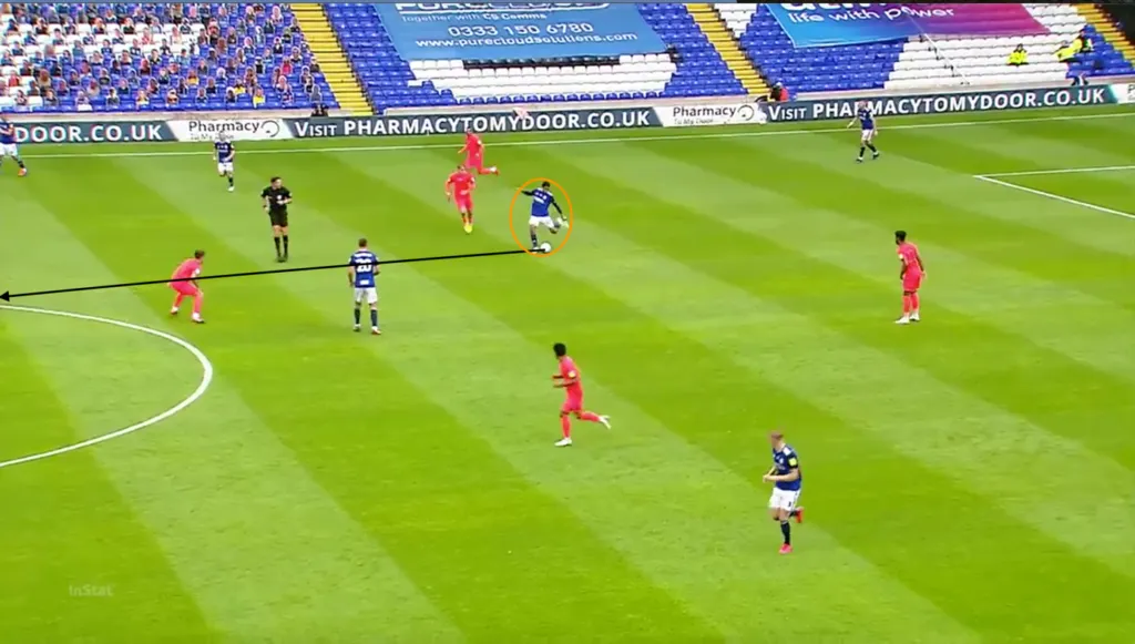 Habár a Birmingham nem egy aktívan letámadó csapat, ha mégis fennragadnak, Bellingham előszeretettel vadászik felelőtlen passzokra, mint itt is látható: