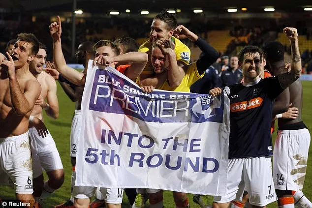 Luton Town játékosai ünneplik a Norwich City legyőzését (ekkor nem volt profi ligában jegyezve a Luton, közel 25 év után sikerült ismét ,,Non-League" csapatnak az ötödik körbe jutnia) Fotó: FA Cup