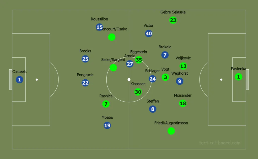 Florian Kohfeldt a brémaiaknál leginkább a 4-3-3/4-3-2-1-es felállást preferálja, mely leginkább a pálya közepére koncentrál. A Schalke ellen 4-4-2-es rombuszalakzatra váltott, ám a Frankfurt elleni, legutóbbi mérkőzésen ismét a korábbi felállást választotta. Pavlenka előtt a védelemben Gebre Selassie, Veljkovic és Moisander mellett Marco Friedl, de akár a sérüléséből visszatérő, svéd válogatott Ludwig Augustinsson is játszhat a balhátvéd posztján. A Vogt-Eggestein-Klaassen középpálya is biztosnak tűnik, elöl pedig a koszovói tehetség Milot Rashica mellett pedig középcsatárban Sargent vagy az ex-lipcsei Davie Selke, harmadikként pedig felállástól függően Leonardo Bittencourt vagy Yuya Osako kezdhet.