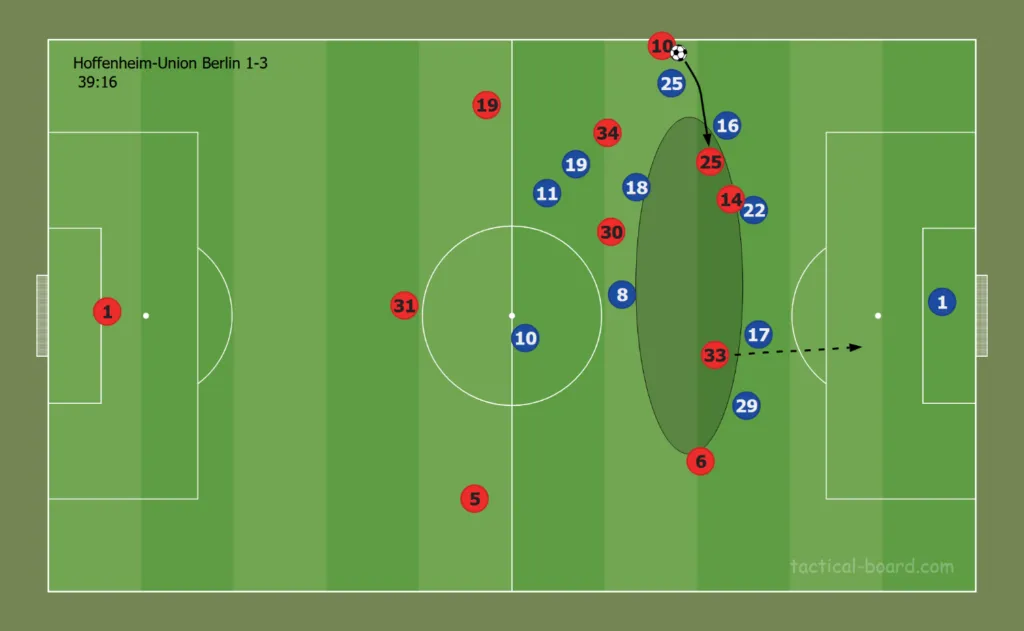 Az Union Berlin elleni novemberi bajnokin többször megfigyelhető volt a középpályássor és a védelem között kialakult nagy távolság, ahol a berliniek sokszor labdához jutottak. Itt Kruse (10) tudta megtalálni ebben a területben Lenzet (25), aki miután remekül lerázta Rudyt (16) mintaszerűen ívelt be a mélységbe beinduló Griesbeck (33) elé, akinek a fejesét Baumann (1) hárította hatalmas bravúrral.