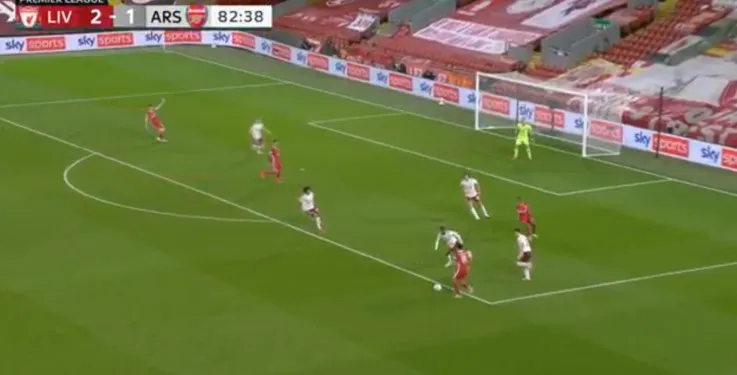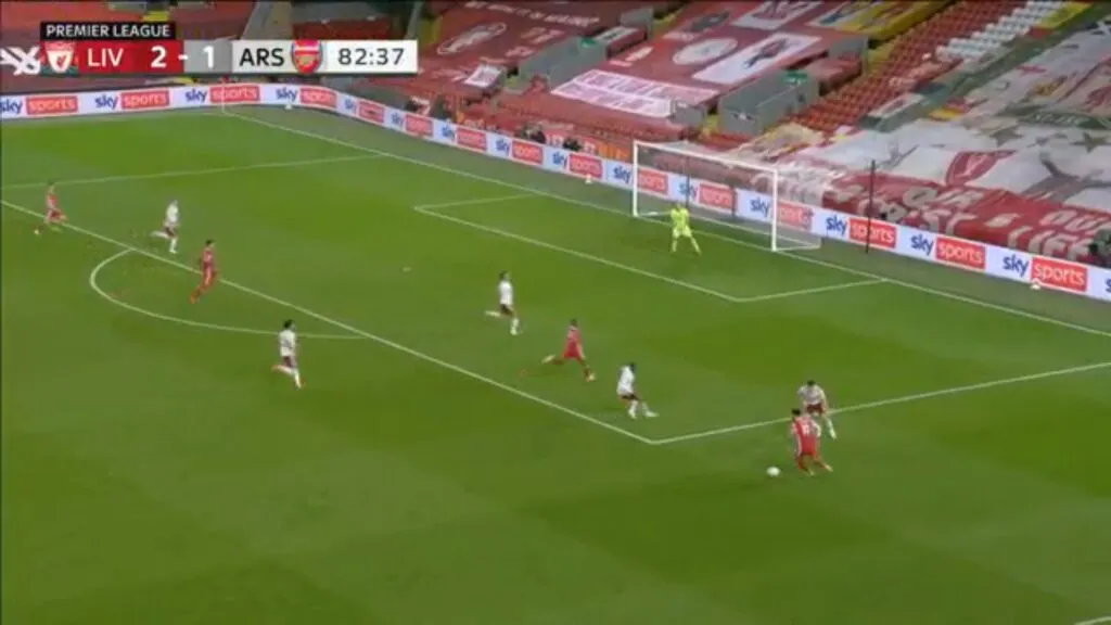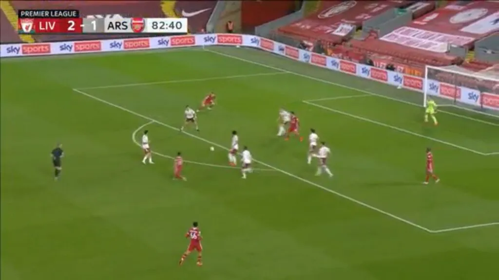 Egy hosszú indítást követően Salah cselez befelé. Jota már tartja a pozícióját a bal oldalon, azonban Holding a rossz visszarendeződés miatt Firminora zár rá.