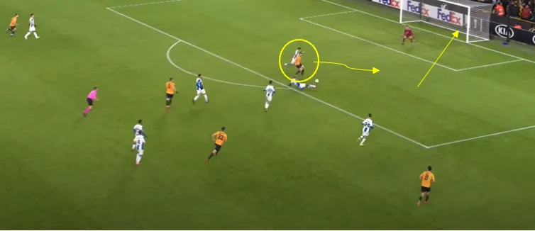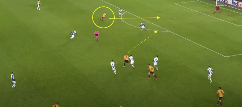 Jota remekül tud beindulni a szélsővédő és a belsővédő közti területre. Itt az Espanyol ellen tette mindezt sikeresen, amikor is Doherty passzát váltotta gólra. Remek az beindulás időzítése, a szöge, a labda átvétele, és a befejezés. A beindulás és a passz ütemét általában jelzés előzi meg, ami lehet a két játékos egymásra nézése, a passzoló labdavezetése (pl.: külsővel/belsővel tolja meg a labdát), esetleg az ellenfél pozíciója.