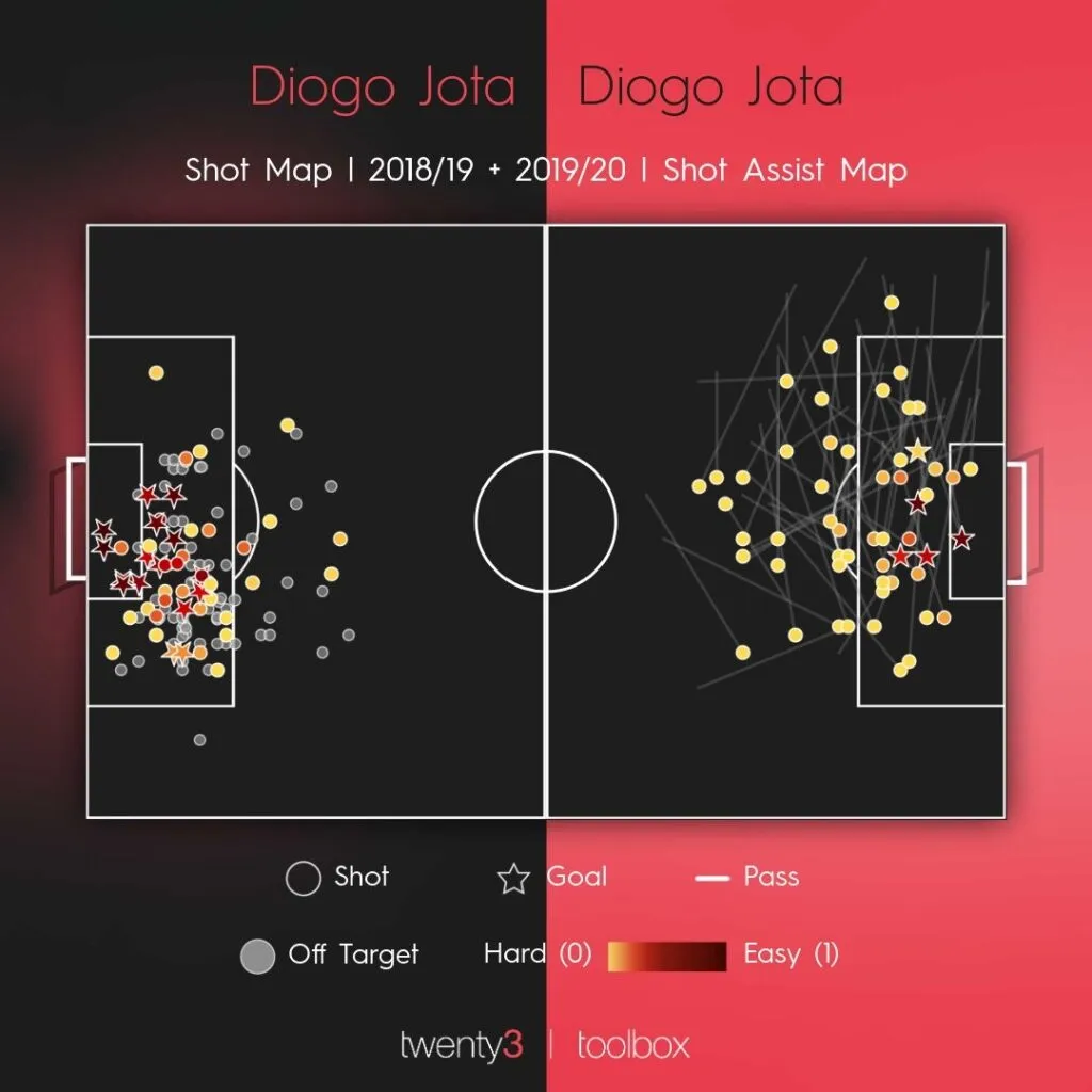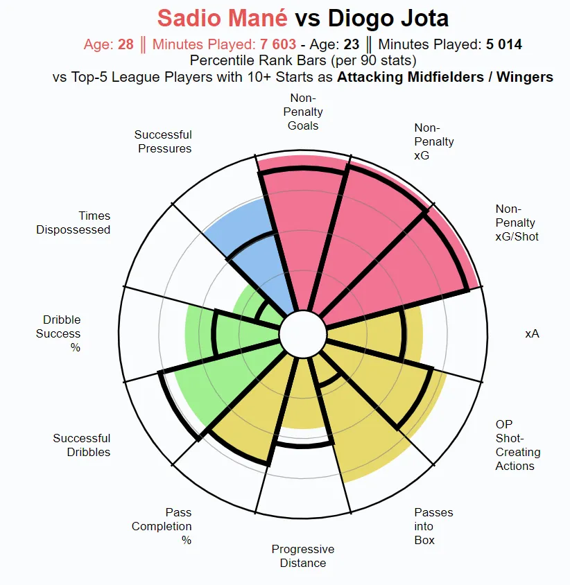 Mané (színes) és Jota (fekete) összehasonlítása az elmúlt két szezonból. Figyelembe véve, hogy Jota egy gyengébb csapatban játszott, nagyon ígéretes játékosnak tűnik.