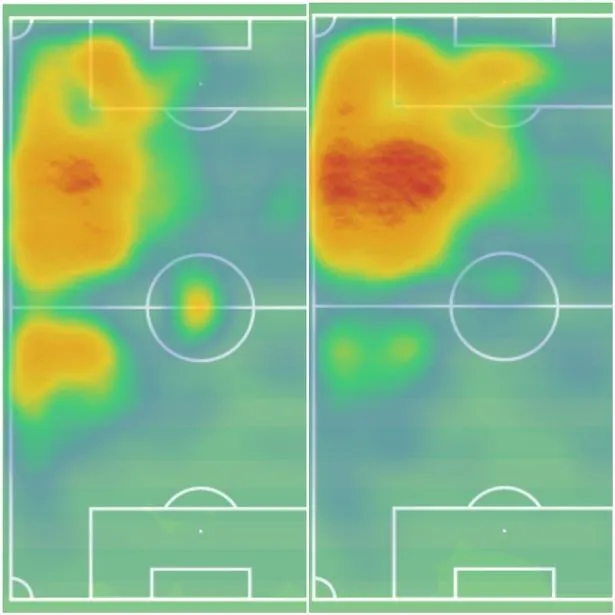 Jota (bal) és Mané (jobb) hőtérképei a tavalyi szezonból.
