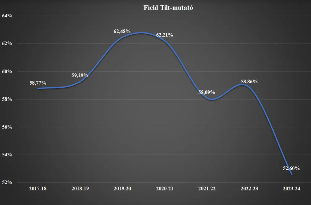 (Forrás: A támadóharmadbeli labdabirtoklás százalékos megoszlása szezonokra lebontva (Forrás: xvalue.ai)