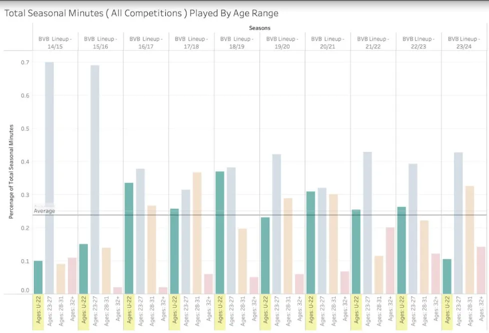 A keretben ugyanakkor egészen a közelmúltig – épp a gazdasági egyensúly fenntartása, fenntarthatósága miatt – hemzsegtek a fiatalok, és akik beváltak közülük, egy-két év után – a klubnak óriási profitot hozva – mentek is tovább. Ironikus módon éppen az az edző, Terzic irányítása alatt változott meg végleg ez a tendencia, aki korábban játékos-megfigyelőként segítette a BVB-t a tehetségek feltérképezésében.