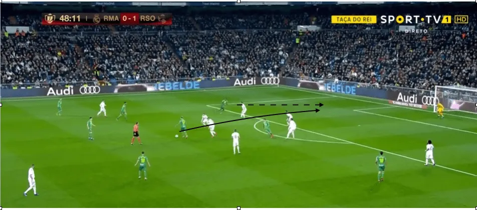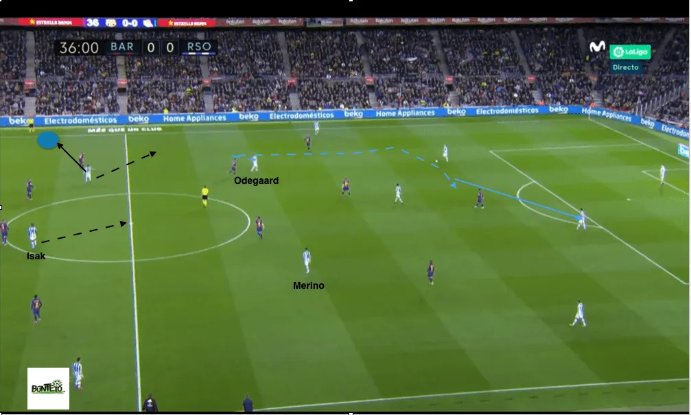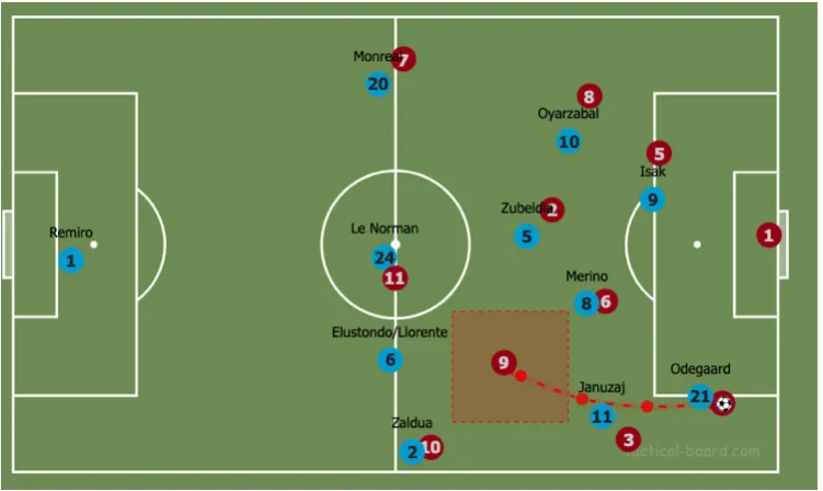 A 4-3-3-as felállásban a Sociedad egyik legizgalmasabb fázisa a labdakihozatal, amit vagy Zubeldia visszaléptetésével (3:2 ellen) oldanak meg, vagy Imanol másik remek húzásával. Ez abban áll, hogy a két legtöbbet a labdát felvevő játékosát, Merinót és Odegaard-ot is rendszeresen visszavonja az első presszingvonal áttörésére.
