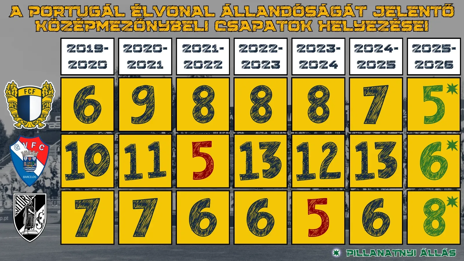 2019 óta mindössze hét klub mondhatja el magáról, hogy folyamatosan a Primeira Ligában szerepelt. Ez egy 18 csapatos bajnokságban kifejezetten alacsony szám, ami jól mutatja a „vetésforgó” intenzitását. Ebben a közegben válik igazán hangsúlyossá a FC Famalicao teljesítménye. A klub a feljutása óta nemcsak stabil élvonalbeli szereplő, hanem minden idényben a tabella első felében zárt, és egyszer sem csúszott a kilencedik helynél hátrébb.