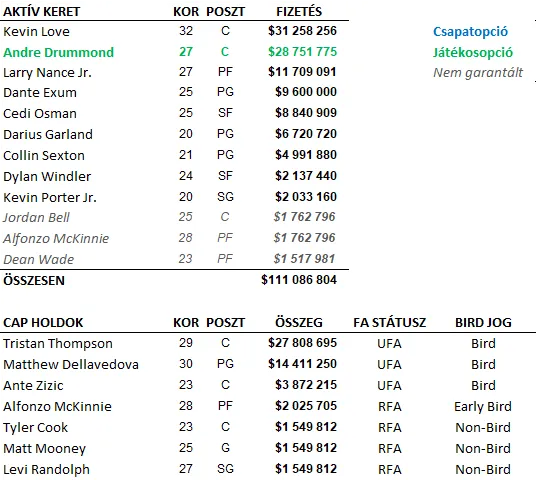 Lejáró szerződéssel rendelkezik Tristan Thompson és Matthew Dellavedova, akik közül TT szinte biztosra vehető, hogy máshol próbál majd szerencsét. Andre Drummonddal a hírek szerint szeretne hosszú távú szerződést kötni a Cavaliers – csak azt nem tudja senki, hogy annak mi értelme lenne –, de a center bérigénye és a csapat elképzelései távol állnak egymástól. A „gyengébbik AD” 28,7 milliós játékosopcióval rendelkezik 2020-21-re, aminél többet a piacon nem tudna kicsikarni, ezért elég jó eséllyel fogadhatunk rá, a következő szezont is clevelandi mezben kezdi meg a játékos.