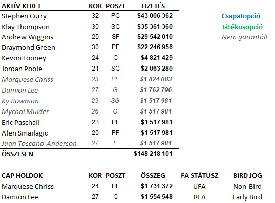 Ez az az eset, amiről korábban azt mondtuk, hogy egy 15 milliós játékos a luxusadóval együtt 60 millióba kerülne. Viszont ez LEHET az az eset is, amikor nem lenne muszáj Wigginst azonnal elpaterolni a spóroláshoz, inkább fel lehetne építeni az értékét, és a szezon során elcserélni. A Curry-Klay-Oubre-Green-Looney-Wiggins hatosfogat, plusz az 1/10-en draftolt újonc (4M), a fejenként 1,5-2 milliót kereső minimumosok (6-7 fő, szumma 11M körül), mindenestül laza 161 milliót kóstálnának.