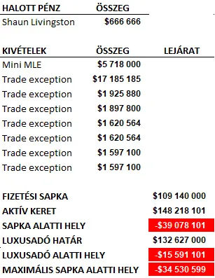 Ha marad a 132 milliós adóhatár, ami felett minden dollárnyi fizetés után pluszban fizetni kell a liga pénztárába, a Dubsnál nem milliók, hanem tízmilliók fognak repkedni! Ráadásnak, a draft után egy pár nappal jár le a korábbi Iguodala-csere során szerzett 17 milliós TPE-jük, amivel kimenő fizetés nélkül tudnak befogadni játékos(oka)t. Az adó feletti élet velejárója továbbá, hogy a majdnem 10 milliós Full MLE helyett az alig valamivel 5 millió felett fizető adófizető MLE, más néven Mini MLE áll rendelkezésükre külső szabadügynökök igazolására.