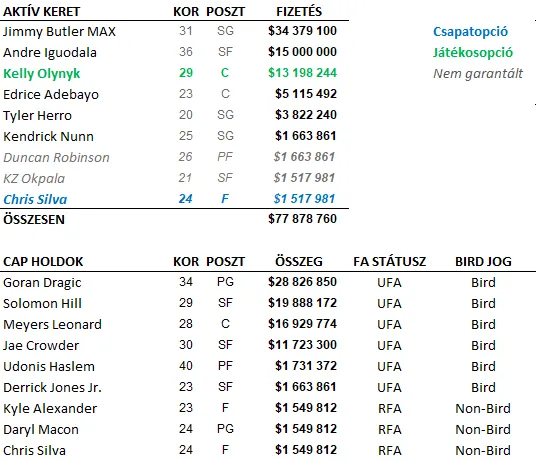 A luxusadó szintjéig egészen nyugodtan fel lehet tölteni a keretet 1 éves szerződésekkel akár kívülről, akár belülről. Dragic (1 év, 25 millió) és Crowder (1 év, 16 millió) maradhatnak, Jones valószínűleg hosszabb távú biztonságot szeretne egy többéves szerződéssel, így távozik, Haslem teljes munkaidőben átmegy segédedzőbe, Adebayo pedig türelmesen kivárja a sorát, nem kap hosszabbítást. Hogy mégse legyen ilyen unalmas az élet, a Philadelphiától valószínűleg lehet venni második körös draftjogot készpénzért, mert van nekik 4, a Heatnek meg egy sem. És hátha sikerül még egy Duncan Robinsont összekaparni valahogy.