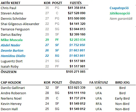 Schröderre mind játéka, mind vállalható fizetése és 2021-ben lejáró szerződése miatt lesz kereslet, ahogy Chris Paul szintén csapatot válthat a télen – sőt, Paul a sikeres szezonja után immár értékként kezelhető, ellentétben a tavalyi állapotokkal! Steven Adams nehezebb ügy, mert amelyik csapatnak jelenleg centerre van szüksége, az nem biztos, hogy 27,5 milliót szeretne áldozni a hiányposzt megszüntetésére. Azért a Charlotte Hornets felé jelentőségteljes pillantások és telefonhívások indulhatnak el Sam Presti irodájából. SGA, Bazley, Dort, Diallo biztosan maradnak, a többi olcsó játékos viszont adott esetben bekerülhet egy-egy játékoscserébe minimális értékként vagy töltelékként.