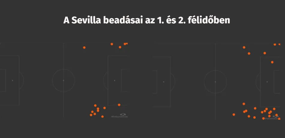 A két ábra a Sevilla beadásainak pozícióit jelzi. A bal oldali az első félidei próbálkozásokat ábrázolja, amin látható, hogy a beadások rendszerint messze voltak a kaputól. A jobb oldali ábrán a második félidei beadásokat láthatjuk, ez már lényegesen jobb képet mutat. A beadások többsége a tizenhatos mellől érkezett. És arra is rávilágít a két ábra, hogy a Sevilla elsősorban a jobb oldalra helyezte a hangsúlyt.
