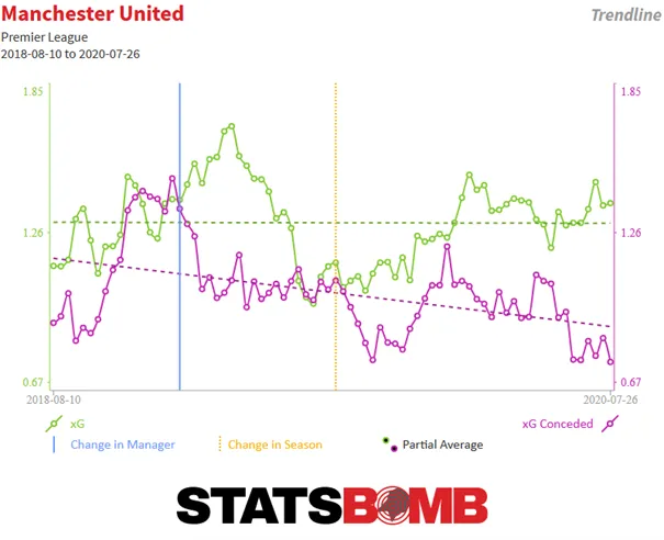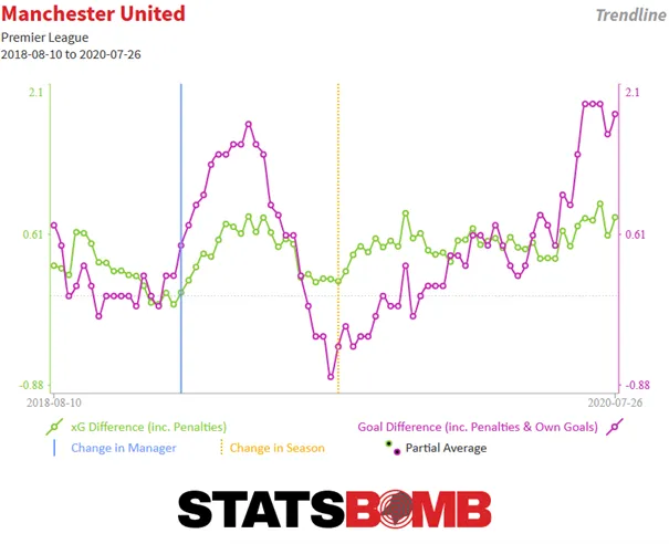 A védelemre kollektíven nincs panasz, inkább aggasztó egyéni hibák okoznak problémát, főként David de Gea, Victor Lindelöf, és Harry Maguire részéről. Zöld=várható szerzett gólok; Lila= várható kapott gólok. Kék=Edzőcsere; Sárga=előző szezon kezdete
