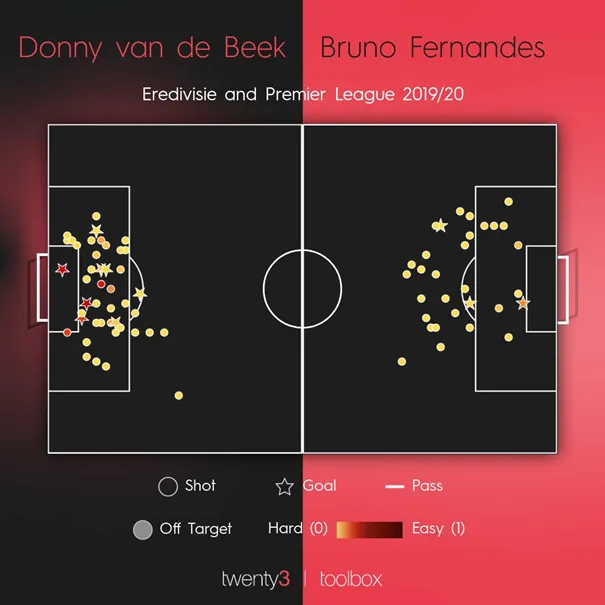 Van de Beek és Fernandes lőlapja nem is különbözhetne jobban. Fernandes mindig is túl sokat lőtt távolról, a holland viszont kiválóan mozog labda nélkül, jó pozíciókba mozog, ahonnan veszélyes lövéseket ad le. (twenty3)