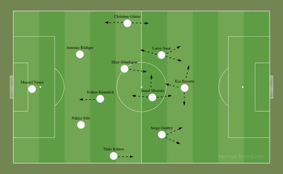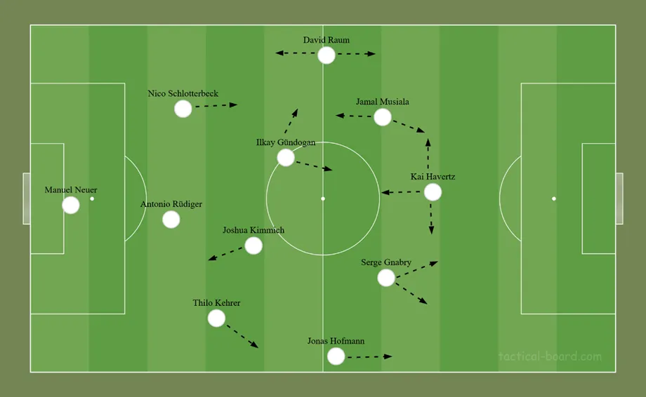 Ilyenkor Kehrer húzódhat ki Hofmann mögé. A mély védelmek ellen Schlotterbeck már említett fellépései lehetnek értékesek és bonthatják meg első lépésben az ellenfelek blokkját, elől pedig Havertzék gyakori elmozgásai teremthetnek területeket. Ha mégsem jön az áttörés, akkor kerülhet sor a mérkőzések végén Füllkrug becserélésére. Téves vélekedés, hogy egy háromvédős felállás csak defenzív lehet, sokszor támadásban pont, hogy ez kecsegtet több variációs lehetőséggel.