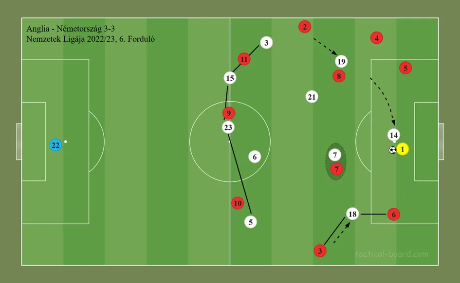 A fenti szituációban is sikeresen hozták zavarba a németek az angolok kapusát Nick Pope-ot (1). Musiala (14) a futásirányával kivette a játékból az angolok jobb oldalát, míg a másik oldalon Hofmann (14) tartott szemmel két játékost. Eközben középen Havertz (7) vette ki a játékból Harry Kane-t (7). A kapus teljesen tanácstalan volt, aminek a végén Musiala majdnem labdát szerzett. A magasabb letámadást a felezővonalnál meghúzott védővonal tudta lehetővé tenni.