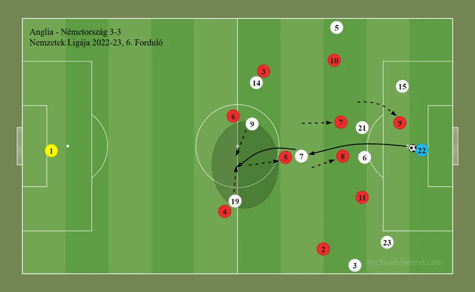 Ebben a szituációban magasan támadtak le az angolok, középen Declan Rice (7) és Jude Bellingham (8) is egészen felléptek. Mögéjük lépett vissza Havertz (7) és kapta is meg a labdát a nyomás alá helyezett kapustól, Marc-André ter Stegentől (22). Havertz Eric Diert (5) kicsalogatta a védősorból, az így keletkező területbe pedig Werner (9) és Leroy Sané (19) azonnal beindultak.