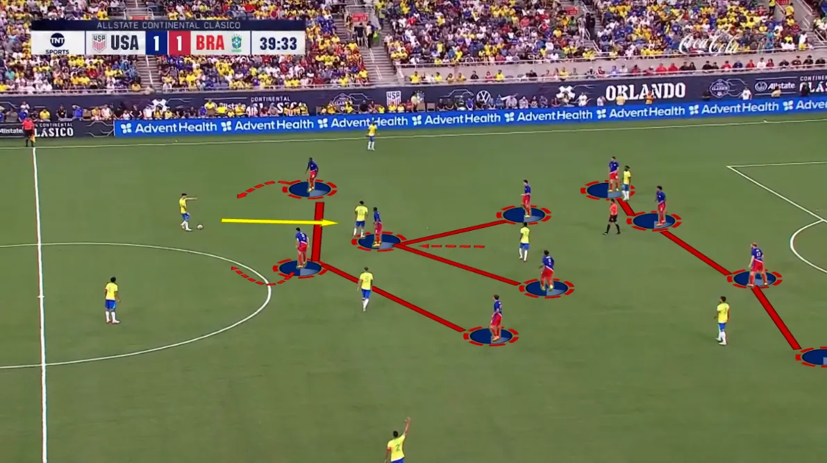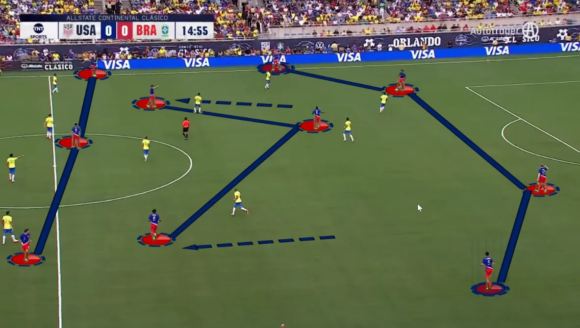 Berhalter csapata nem csak a hatékony letámadást követően képes lehetőségeket kialakítani, hanem az Egyesült Államok válogatottjának van saját labdás játékrendszere és játékelgondolása. Jellemzően 4–3–3-ban építkeznek. Már alapból a két szélső védő (Joseph Scally és Antonee Robinson) a vonal mellett helyezkedik, míg a nyolcasok (Giovanni Reyna és Weston McKennie) magas pozíciót vesznek fel a két félterületben, nem messze a centertől. Igyekeznek minél jobban kihasználni a pálya szélességét és mélységét, de mégis abba a hibába esnek, hogy a pálya középső részét elhanyagolják. Csak a hatos, Yunus Musah marad hátul a védők előtt, emiatt megszűnik az összeköttetés az elöl helyezkedők és a hátul labdát birtokló játékosok között. Egy agresszívan letámadó csapat ellen, mint Brazília, ez jelentős problémákat eredményezhet Berhalter és a csapat számára.