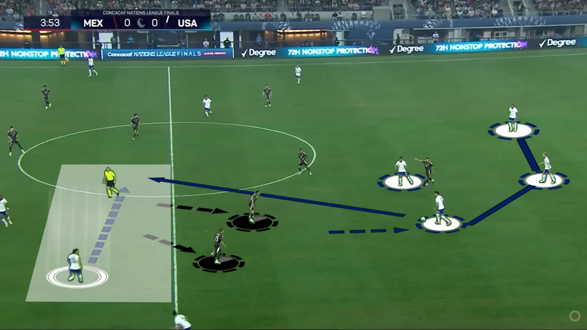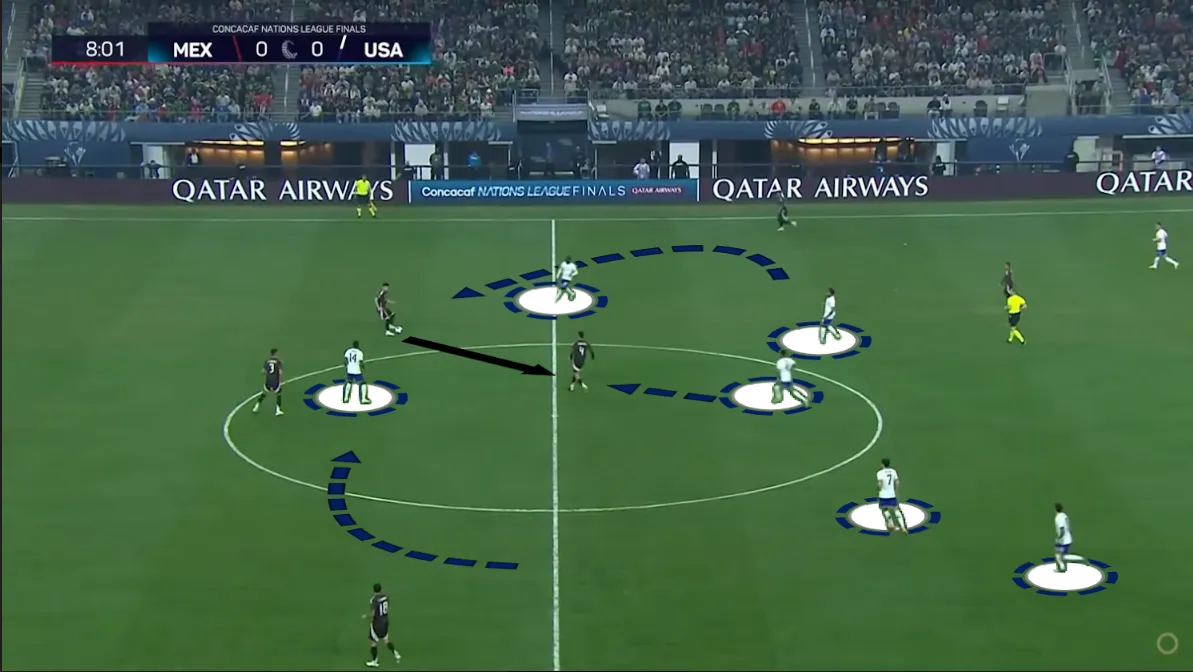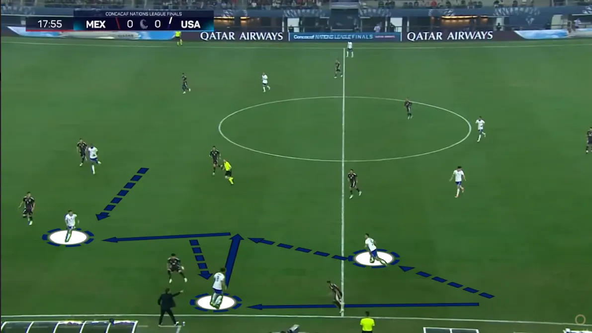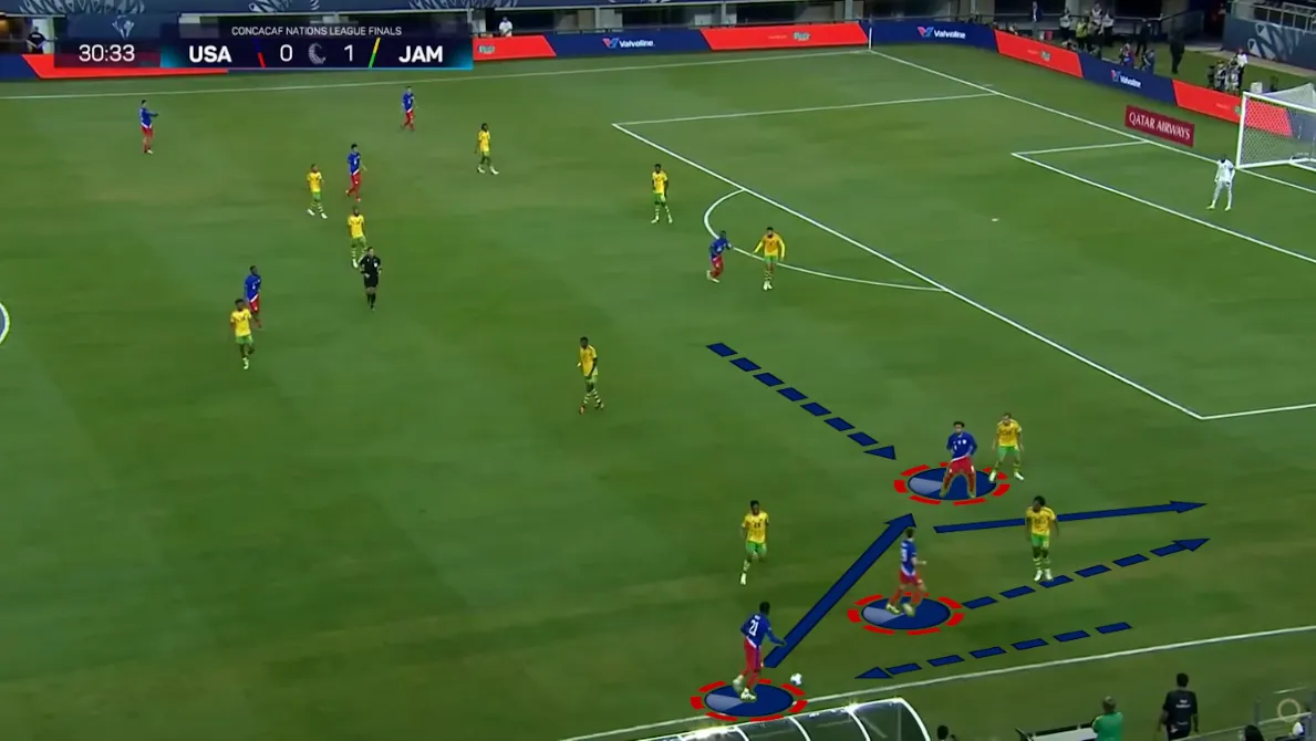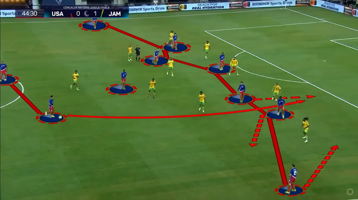 Az teljesen változó, hogy melyik amerikai mozog vissza. Jamaica ellen például folyton más játékos vette fel a labdát a belső védőktől. A jobb oldalon a jobbszélső, Timothy Weah és a jobb oldali nyolcas, Malik Tillman lépegetett vissza, míg a bal oldalon az ottani nyolcas, McKennie kérte el rendszeresen mélyebben a labdát. Ezzel ellentétben Mexikó ellen már rendszeresen Reyna lett az ideiglenes harmadik belső védő, függetlenül a támadás irányától.