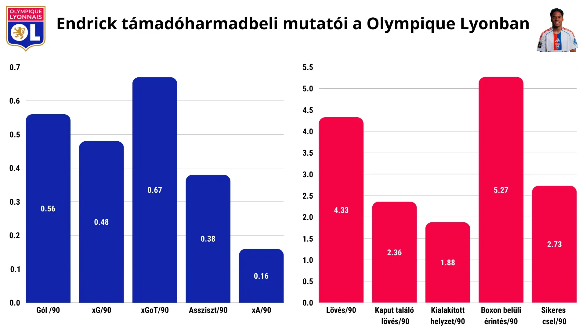 A kölcsönszerződés után az Olympique Lyonnais rendszerében Endrick először került olyan szerepkörbe Európában, amely valóban illeszkedik a játékprofiljához. Míg korábban elsősorban középcsatárként számoltak vele, Paulo Fonseca elképzelései szerint gyakran a jobb oldali támadózónából indul. Ez a pozíció látszólag távolabb helyezi a kaputól, valójában azonban több teret ad azoknak a mozgásoknak, amelyekben a legerősebb.