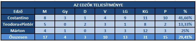 Costantino a hetedik helyen adta át az MTK-t, tíz pontot gyűjtve, ami kétszer annyi, mint amennyit a távozása után össze tudott szedni, hasonló meccsszám mellett az együttes.