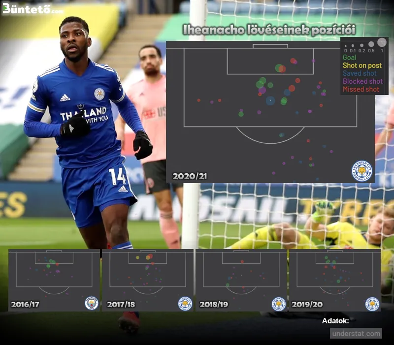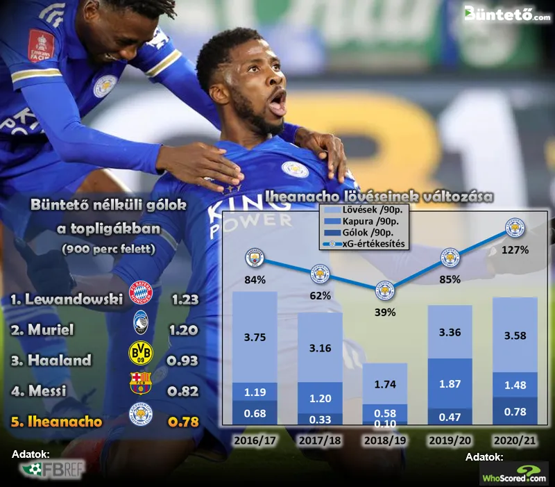 Ehhez kellett az is, hogy Brendan Rodgers hosszabb ideig a két csatáros játékra álljon át, és Jamie Vardy mellett bal lábasként a jobb oldalon biztosítson helyet Iheanachónak. A nigériai támadó számára nem teljesen új szerepkör ez, de korábban Manchesterben és új állomáshelyén is leginkább középen, a védők sűrűjében került bevetésre. A csatártárs által teremtett némiképp szabadabb területeken, kissé jobbról befelé húzva azonban jobban meg tudja válogatni a lövőhelyzeteit, így idén annyi próbálkozása van, amennyi a Leicesterben korábban még nem volt. Ráadásul ezek egyre nagyobb arányban találják is el a kaput, a várható gólokhoz (xG) viszonyított helyzetkihasználása pedig először megy a pozitív, 100% feletti tartományba, ugyanis alig 7,9 xG-nyi veszélyességű lehetőségből érte el a tíz bajnoki találatát.