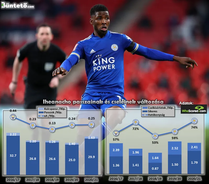 Ez valamennyire hozzájárul a lövőhelyzetek számának megnövekedéséhez is, ám a cselek minőségi javulása a támadók esetében leginkább az előkészítésekben szokott visszaköszönni. Így van ez Iheanacho esetében is, hiszen nem csak csapata összjátékából veszi ki olyan sok átadással a részét, mint a Leicesterben korábban soha (29,9 passz 90 percenként), de közben több lövőhelyzetet kialakító kulcspasszt is oszt ki (1.63), amelyekből a várható asszisztok (xA – expected assist) értéke is magasabb, mint jelenlegi csapatánál korábban bármikor (0,25/90 perc).