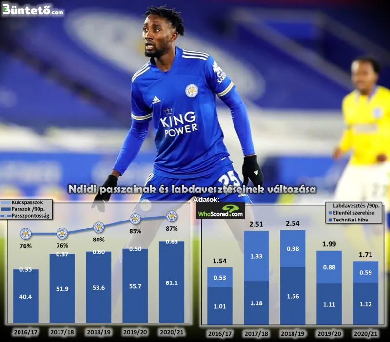 Még inkább felkeltheti Ndidi iránt az érdeklődést, hogy évről évre nagyobb szerepet játszik az összjátékban és a labdakihozatalokban, idén már meccsenként 61.1 átadással, melyek egyre pontosabbak is és a 90%-os precizitást közelítik. Hosszú átadásokra ugyan ritkán vállalkozik, átlagban 2,3-szor meccsenként, azok hatékonysága pedig a közepesnek mondható 50-60% között mozog, de a szerény számú kulcspasszaiban is megfigyelhető egy enyhe emelkedés (idén 0.63 meccsenként).