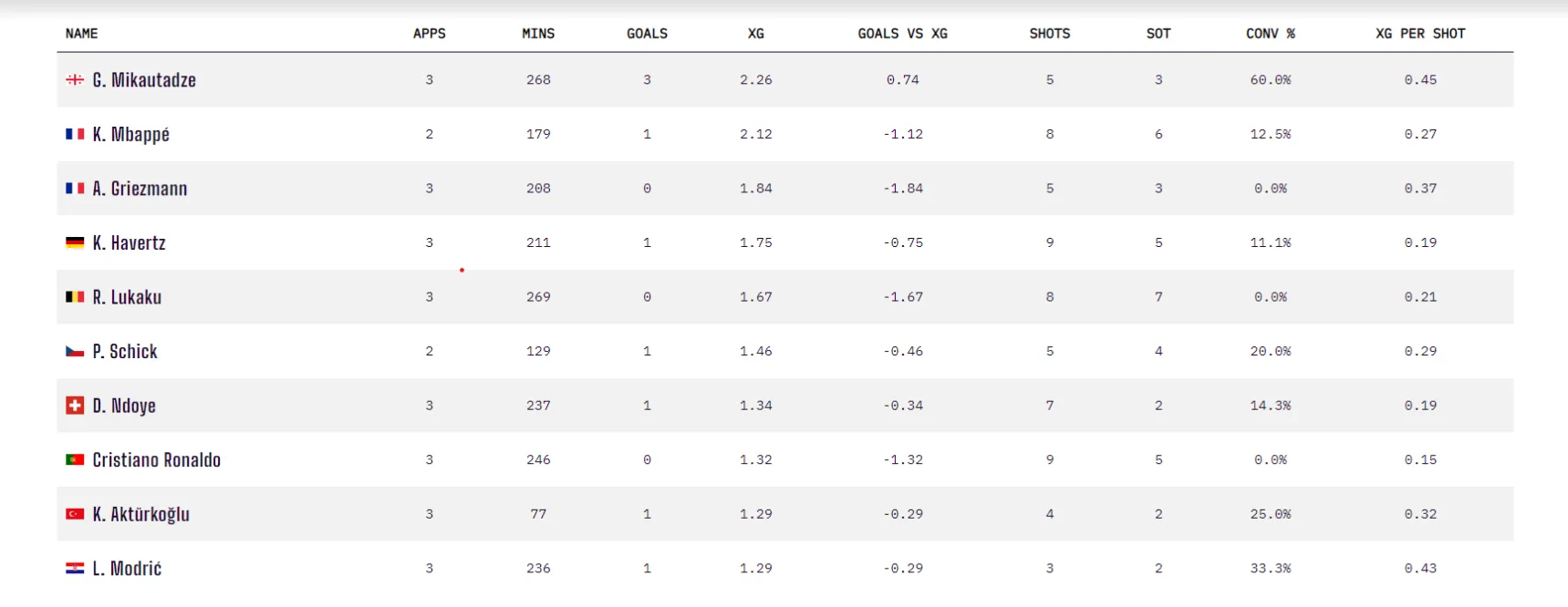 A Metzben játszó Georges Mikautadze a tornán eddig ötször találta el a kaput, és három gólt szerzett belőle (igaz, ebből kettő tizenegyes gól volt). Minden csoportmeccsen betalált, erre a korábbi tornákon olyan játékosok voltak képesek, mint Cristiano Ronaldo, Gareth Bale, Ruud Van Nistelrooy vagy Hriszto Sztoicskov.