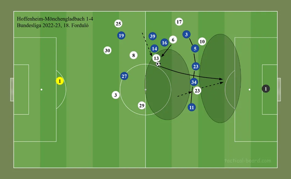 Nézzünk néhány jellemző példát. A Borussia Mönchengladbach két kulcsemberének, Lars Stindlnek (13) és Jonas Hofmannak (23) a lehető legjobb körülményt teremtette meg a Hoffenheim lagymatag letámadásával. Stindlt nem támadták elég határozottan a hazai középpályások, így egy Christoph Kramerrel (6) végrehajtott kényszerítő után könnyen utat talált a pálya centrumába, ahonnan mintaszerűen ugratta ki a védők mögé beindult Hofmannt, aki végül 2-0-ra alakította a mérkőzés állását.