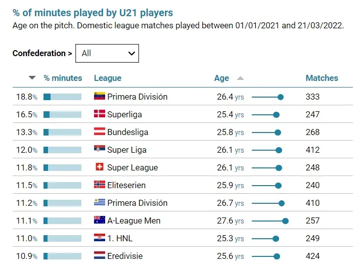 Az összesített számokat figyelembe véve az előző szezon során a Liga FUTVE (Primera División) csapatai közel 20%-ban alkalmaztak olyan játékost, aki még nem töltötte be a 22. életévét. A CIES Football Observatory adataiba már az idei szezon elejéből is bekerült néhány mérkőzés, így pedig a hivatalos mutató 18,8% lett. Az előző idény során összesen 44 játékos lépett pályára még a 18. születésnapja előtt, amire igazán kiemelkedő eredményként tekinthetünk, még úgy is, hogy 21 csapattal számolhattuk, de az együttesenként kettő tinédzser feletti átlag példátlan.
