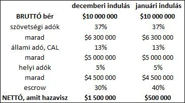 Tegyük fel, egy játékos 10 milliót keres. Ez a bruttó bére, papíron – amiről tudjuk, sosem annyi, amennyi. A számolásom lehet, hogy nem tartalmaz minden adónemet, ami egy bért az USA-ban sújt, de a logika azért látszik: a szövetségi adók, az egyes államokban érvényes jövedelemadók és a helyi adók után alanyunk már a fizetése kevesebb mint felét láthatja a számláján. Ha ebből még további escrow-t tart vissza a liga, látható, hogy a kaliforniai csapatokban pattogtató játékosok a fizetésük 5-15%-át viheti haza ténylegesen. (Más államokban kisebb az állami jövedelemadó, Florida és Texas például 0%-os adókulcsot alkalmaz. Az átlagos játékos tehát 15-28%-ot kap meg a pénzéből egy decemberi indulás esetén, illetve 5-18%-ot januári idénykezdetnél.)