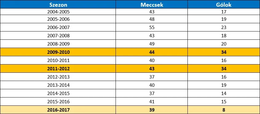A 2017-es távozásáig 15 szezont húzott le a „vörös ördögök” mezében, s ezek közül csupán egyetlen egyszer nem érte el a tíz gólt, viszont két alkalommal is harminc felett termelt.