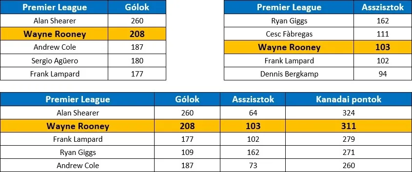 - Egyike azon három játékosnak, akinek mind gólok, mind gólpasszok tekintetében száznál is több szerepel a neve mellett;