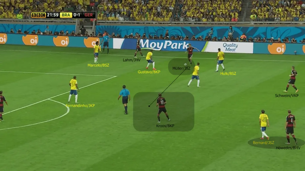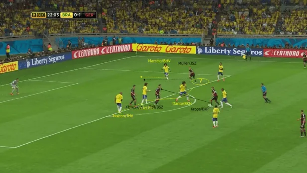 Az intenzív letámadással már a Chile elleni nyolcaddöntőben is meggyűlt a bajuk a braziloknak, rengetegszer kényszerültek ívelésre a labdakihozatal során. Löw tudatosan készülhetett erre, mert a németek hagyták a brazilokat felhozni a labdát egy bizonyos pontig, a félpálya környékén azonban komoly letámadásba kezdtek, elszívva a levegőt a brazil középpálya elől. Mivel Luiz Gustavo labdabirtoklásban gyakran visszalépett a középhátvédek vonalába, a németek 4-1-4-1-es védekezőalakzata gyakran afféle 4-1-3-2-vé alakult. ilyenkor a Khedira-Kroos duó egyike Kloséhez csatlakozott letámadni, másikuk pedig szinte piócaként tapadt a középpályán immár egyedül maradt Fernandinhóra. A németek letámadására tökéletes példa a negyedik gól, ahol hasonló módon szereztek labdát.