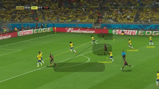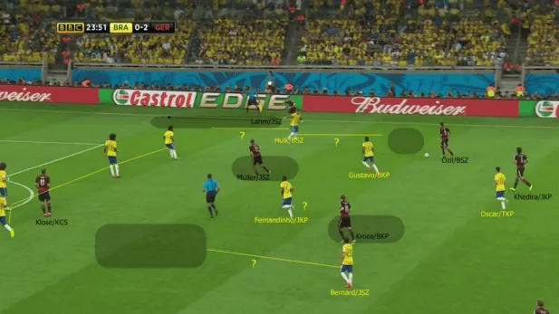 Az életveszélyes német kontrák ellenére a házigazdák még így is megúszhatták volna a mérkőzést kisebb veréssel (noha hét perc alatt négy bekapott gólra nagyon nehéz reagálni), ám a brazilok felállt védekezése is rengeteg hibát tartalmazott. A brazilok a saját térfelükön elvileg 4-4-2-t formáztak, ám a németektől látott kompakt területvédekezésnek itt nyoma sem volt. Helyette sokszor teljesen ötletszerű módon, a legközelebb lévő német játékost emberfogással próbálták felvenni a hazaiak, de még ezt sem egy adott területen belül, ami rövid úton teljes káoszt okozott. Ráadásul Bernard és Hulk sem bizonyult túl használhatónak a szélek levédésében. Erre tökéletes példa a második és a harmadik német gól.