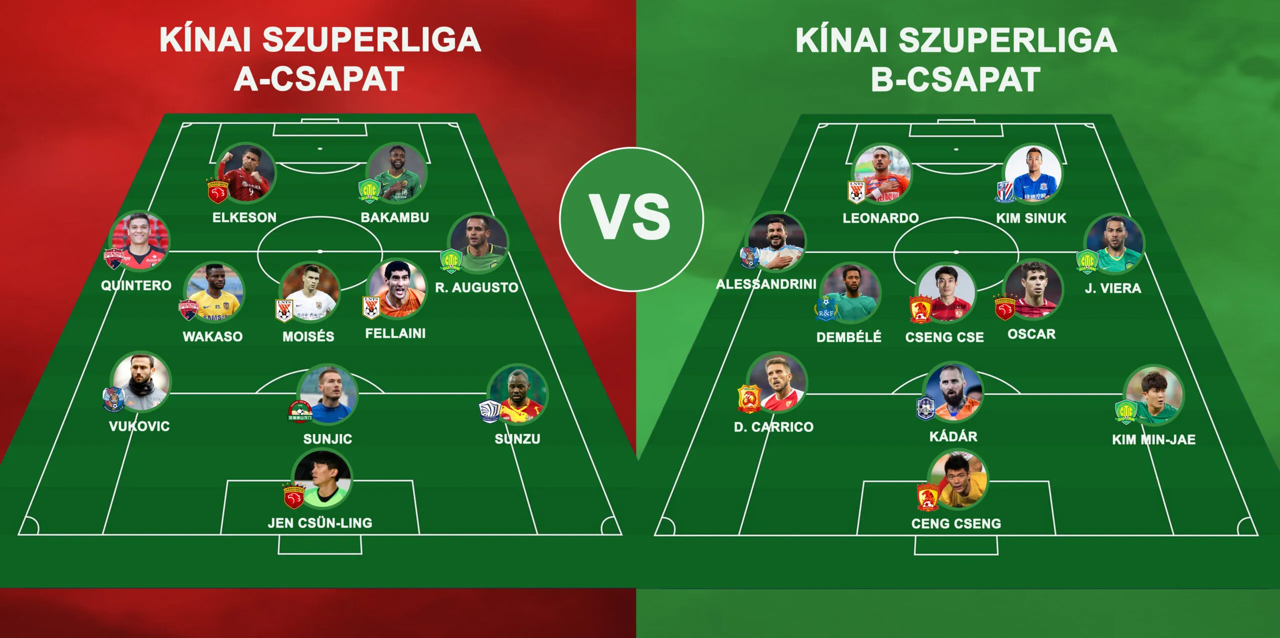A drasztikus átalakítások viszont nem jelentik azt, hogy 2021-ben már ne lenne érdemes odafigyelni a Chinese Super League mérkőzéseire, még ha olyan ászok távoztak is az országból, mint a Brazíliába hazatérő Hulk és Éder, az izraeli válogatott Zahavi-Saba duó, vagy a korábbi nápolyi csillag Marek Hamšík. Ennek érzékeltetésére először arra gondoltunk, összeállítunk egy álomcsapatot a liga idei kiemelkedő futballistáiból, azonban szembesültünk két apró problémával: túl sok közismert, egykori topligás, válogatott spíler futballozik Kínában ahhoz, hogy igazságos, hiányérzet nélküli 11-et hozhassunk ki belőlük, ráadásul így fájdalom, kimaradna az egyetlen jelenlegi magyar légiós, Kádár Tamás, aki bizony egyelőre nem hozza a tőle elvárt teljesítményt a Távol-Keleten… Így arra jutottunk, egy A- és egy B-csapattal szemléltetjük a kínai liga aktuális erejét, hozzátéve, a képzeletbeli gárdák összecsapásain ötből legalább egyet azért képes lenne megnyerni a fakó is!