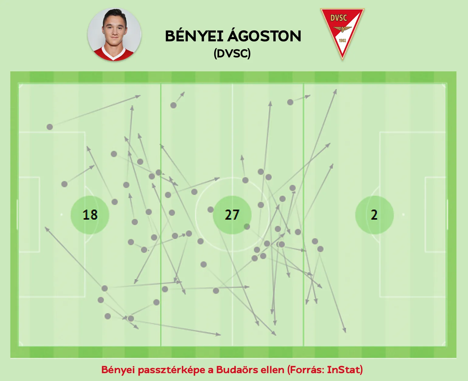 91 százalékkal (47/43 sikeres) passzhatékonysággal zárta a kilencven percet, amit egyedül a budaörsi Tamás Olivér tudott megközelíteni (38/34 - 89%). Ezek nagy része szélességi átadás volt, kevés kockázatot vállalt, de éppen ez adott stabilitást a DVSC-nek.