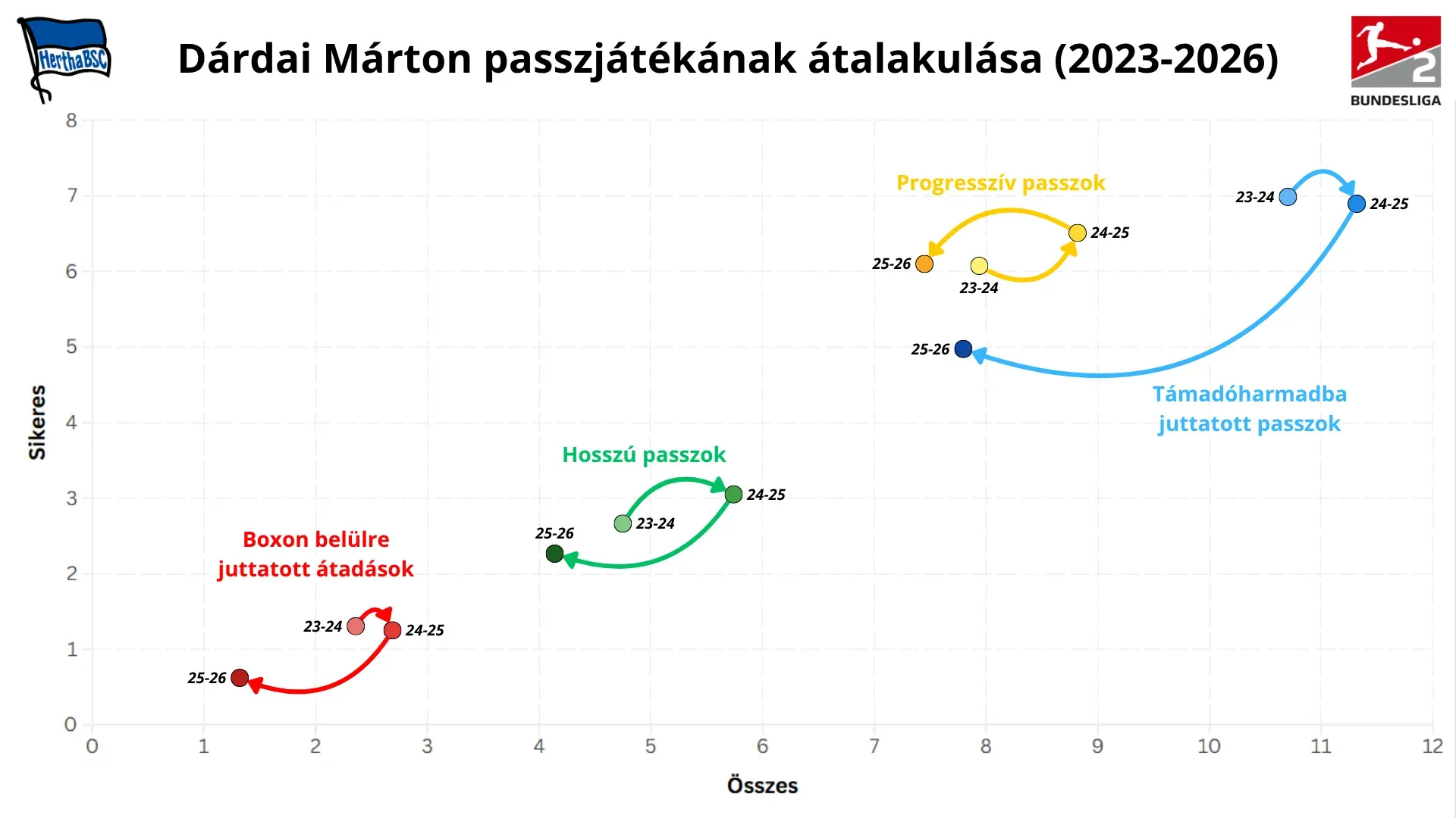 Ez a váltás Dárdai játékában is jól lekövethető. A progressziós volumen csökkent, ugyanakkor a kivitelezés minősége javult. A 80% feletti progresszív passzpontosság arra utal, hogy a döntéshozatal tudatosabbá vált, a passzok kiválasztása jobban illeszkedik a csapat struktúrájához. Kevesebb, de jobban időzített és nagyobb valószínűséggel sikeres előrejáték jellemzi.