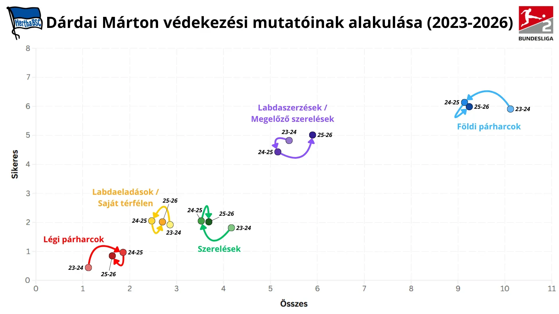 Ebben a szezonban tehát Dárdai profilja elmozdul a magas volumenű progresszív védőtől egy kiegyensúlyozottabb, kontrollorientált belső védő irányába, ahol a döntéshozatal minősége és a védekezési érettség válik meghatározóvá.